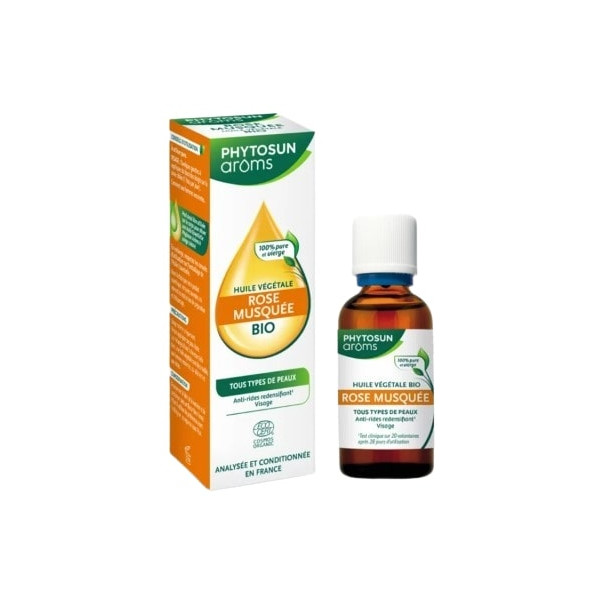 L'Huile Végétale Rose Musquée Bio élaboré par les laboratoires Phytosun Arôms s'utilise pour réduire les rides et les rides de la patte d'oie. Cette huile hydrate, assouplit et redensifie efficacement la peau. Elle convient à tous les types de peaux du visage.