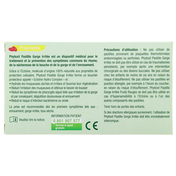 Les pastilles sans sucre Phytoxil Gorge Irritée à l'arôme de fruits rouges est un dispositif médical indiqué pour le traitement et la prévention des symptômes du rhume, de l'enrouement et de la sécheresse de la bouche et de la gorge. Ces pastilles conviennent aux adultes et enfants de plus de 6 ans.