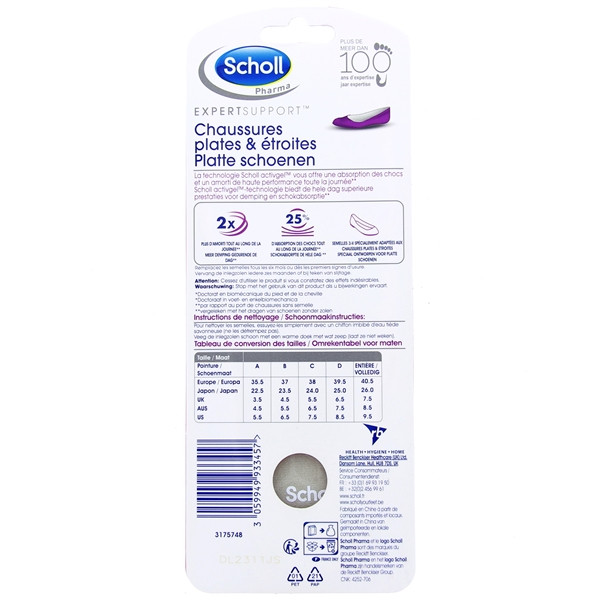 Les Laboratoires Scholl créent en collaboration avec un docteur expert du pied la semelle ActiGel, adaptée aux chaussures plates et aux ballerines. Disponible dans les pointures allant de 35,5 à 40,5. Réalisée à partir de la technologie Scholl ActivGel, cette semelle assure un confort permanent aux pieds au quotidien. De plus, elle offre un amorti supplémentaire et absorbe parfaitement les chocs du talon, ainsi, les pieds restent légers durant la journée. Ces semelles restent en place solidement sans aucune compression au niveau des orteils.
