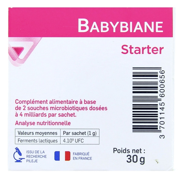 Babybiane Starter est un complément alimentaire spécialement conçu par le laboratoire PiLeJe. Il est présenté dans des sachets. Indiqué aux bébés de 0 à 2 ans, ce produit apporte des souches microbiotiques spécifiquement sélectionnées dosées à 4 milliards. Ce supplément est particulièrement utile pendant les 9 mois de grossesse et les 2 premières années du bébé. Cette période de 1 000 jours est primordiale pour la santé de l’enfant ainsi que pour celle de la future maman.