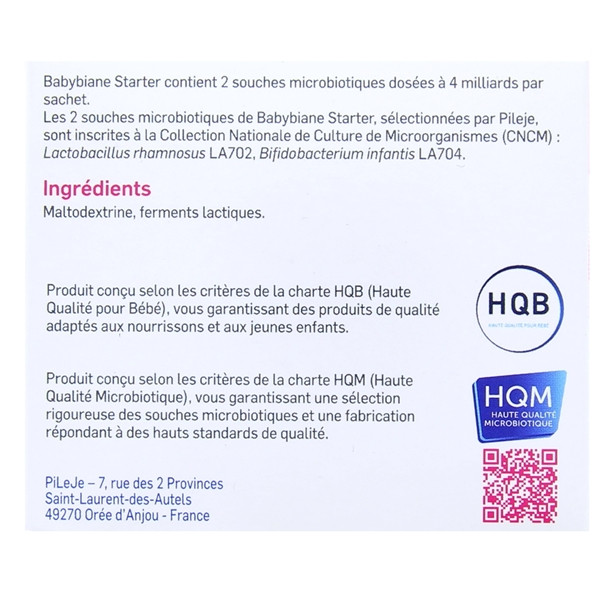 Babybiane Starter du laboratoire Pileje est un complément alimentaire destiné à apporter aux bébés de 0 à 2 ans deux souches microbiotiques dosées à 4 milliards par sachets.