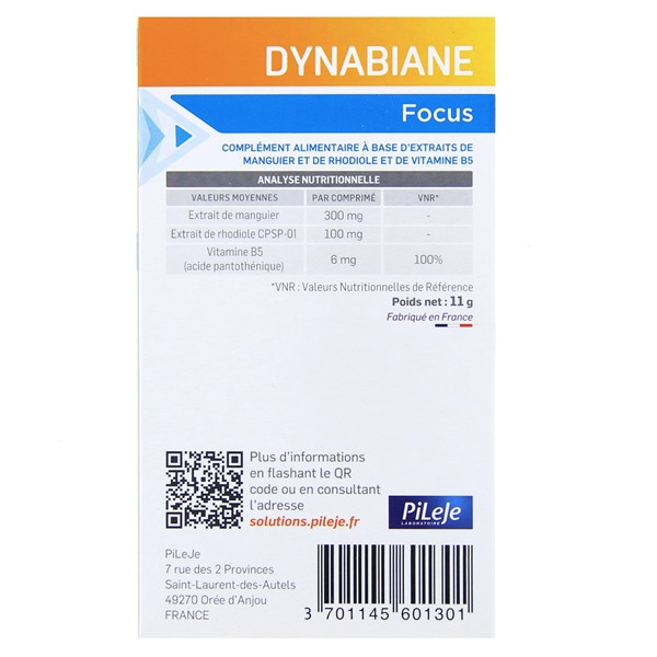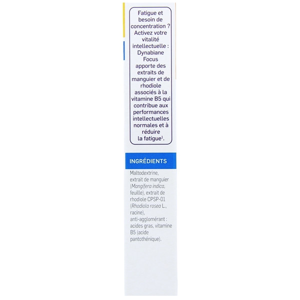 Dynabiane Focus du laboratoire Pileje est un complément alimentaire à base de Vitamine B5 et d'extraits de Manguier et de Rhodiole pour contribuer aux performances intellectuelles normales et à réduire la fatigue.