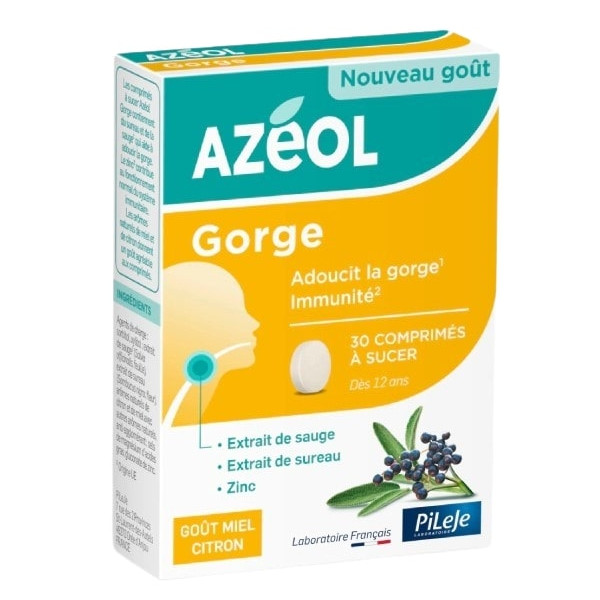 Azéol Gorge Miel Citron du laboratoire Pileje est un complément alimentaire à base d'extrait de sauge, d'extrait de sureau et de zinc. Il est indiqué pour adoucir la gorge tout en soutenant le système immunitaire.