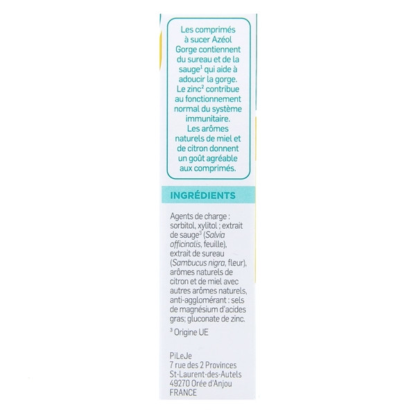 Azéol Gorge Miel Citron est un comprimé à sucer spécialement conçu par les laboratoires PiLeJe. Il s’agit d’un complément alimentaire pour la santé de la gorge et pour stimuler le système immunitaire. Comprenant le larynx et le pharynx, la gorge est un lieu de passage (air, liquide, solide) particulièrement exposé aux agressions extérieures. Sachez que pour défendre son organisme, chaque individu possède un système de défense naturelle unique qui peut être compromis en cas de gorge irritée. Grâce à sa formulation, ce supplément va adoucir naturellement la gorge tout en aidant à obtenir un système immunitaire en bonne santé.