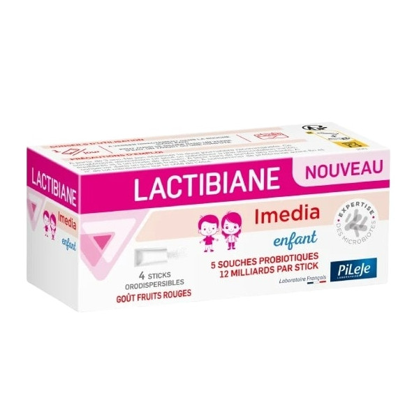 Lactibiane Imedia Enfant du laboratoire Pileje est un complément alimentaire formulé à base de 5 souches probiotiques dosées à 12 milliards par stick.