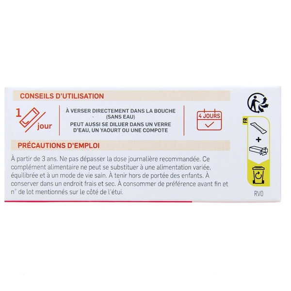 - Une fois par jour, administrer directement 1 stick orodispersible dans la bouche de l’enfant, sans ajouter de l’eau. Sinon, dissoudre le stick dans un verre d’eau, ou mélangé à un yaourt ou à une compote. Puis, donner la préparation à l’enfant.