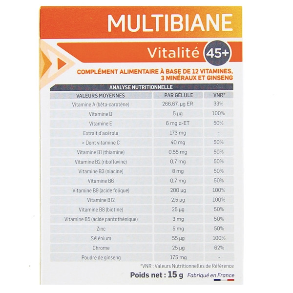 Multibiane Vitalité 45+ x30 gélules végétales de la marque Pileje est un complément alimentaire comportant 12 vitamines, 3 minéraux et du ginseng. Il est indiqué en cas de fatigue physique ou mentale due à un surcroît de travail intellectuel, à une alimentation inadaptée, à un évènement malheureux de la vie, etc.