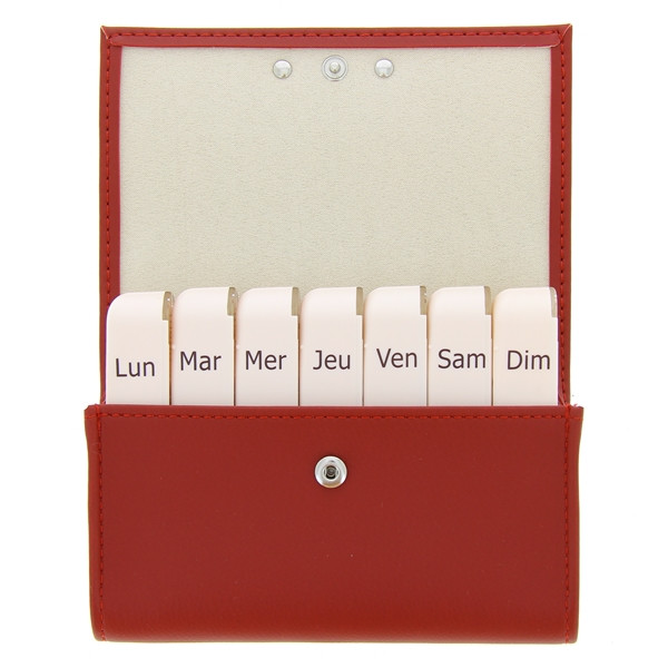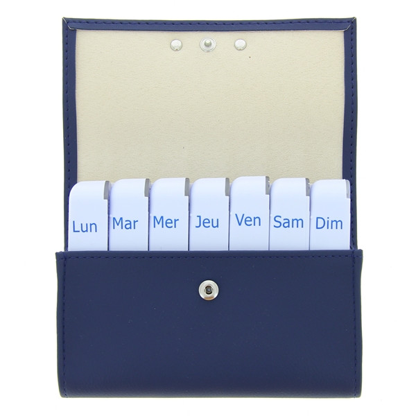 Trousse à pilule en cuir contenant 7 boîtes modules indépendants (lundi, mardi, mercredi, jeudi, vendredi, samedi, dimanche) et 4 cases par module (matin, midi, soir, nuit).