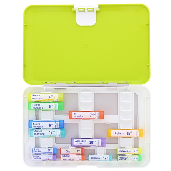 Pilulier homéopathique en matière plastique avec emplacement pour 18 tubes et 8 doses.