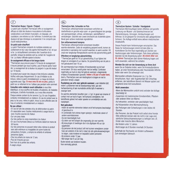Les patchs ThermaCare Nuque/épaule/poignet, sont proposés au nombre de 6 patchs auto-chauffants, leur effet provient d'une technologie brevetée.