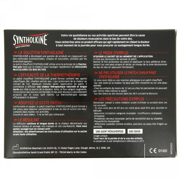 Les patchs chauffants étendus SyntholKiné de la marque Synthol ont été conçus pour soulager durablement les douleurs musculaires particulièrement au niveau du bas du dos, mais aussi de la nuque et des épaules.