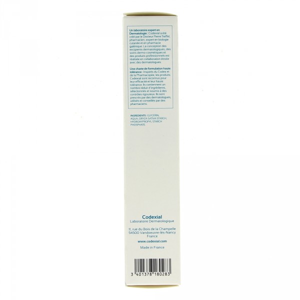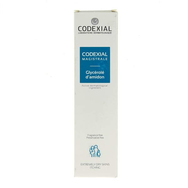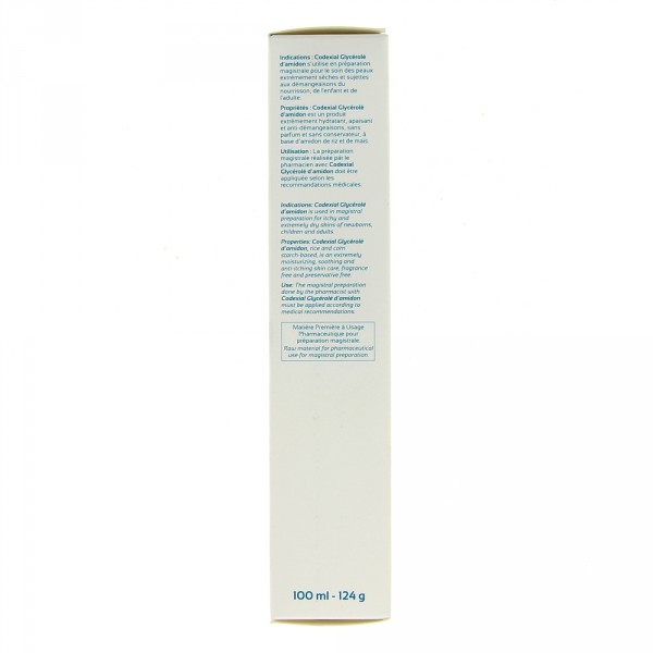 Le produit Glycérolé d'amidon des laboratoires dermatologiques Codexial est également un excipient destiné aux préparations magistrales. Une préparation à utiliser pour soigner les peaux prurigineuses et extrêmement sèches. C’est un soin cutané pour toute la famille, y compris les nourrissons. C’est un produit de très haute tolérance cutanée, car la formule est à base d’amidon de blé, de maïs et de riz. Les risques d’allergie sont donc très réduits. Le Glycérolé d'amidon peut être utilisé pur.