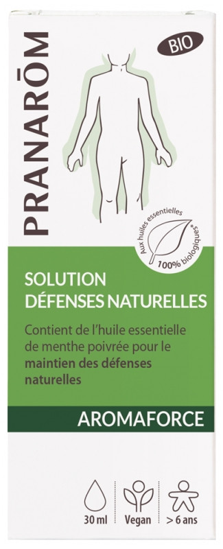 Les huiles essentielles qui composent la solution Aromaforce Défenses Naturelles Bio de Pranarôm adoucissent les gorges irritées, rafraichissent l'atmosphère et soutiennent le système immunitaire de l'organisme. Solution multi-usages : voie orale, friction, inhalation ou diffusion.