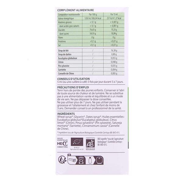 Huiles essentielles : eucalyptus globulus (eucalyptus globuleux) – pinus sylvestris (pin sylvestre) – citrus limon (citron) – cinnamomum cassia (cannelle de Chine) – satureja montana (sarriette) – ficus carica syrup (sirop de figue) – glycerin – fructose syrup.
