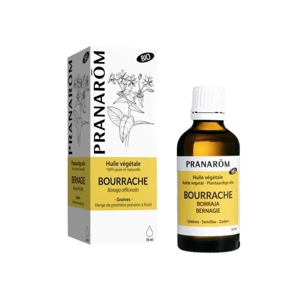 Obtenu par première pression à froid des graines de fleurs de bourrache, cet extrait huileux plait pour ses diverses vertus dermo-cosmétiques. On s’en sert notamment en cosmétique cutanée pour ses propriétés raffermissantes, régénérantes et hydratantes. Cette huile végétale doit ces vertus à sa composition riche en vitamine E, ainsi qu'en acides gras essentiels oméga (3, 6 et 9). Elle contient une proportion significative d'acides gras polyinsaturés, notamment de l'acide gamma-linoléique, ainsi que des acides gras mono-insaturés et des phytostérols antioxydants. Ces divers actifs lui permettent de nourrir la peau en profondeur, de lui apporter élasticité, douceur et jeunesse. Elle se consomme aussi comme complément alimentaire, notamment pour des problèmes liés à la ménopause, au cholestérol, aux règles comme les symptômes prémenstruels, à l'arthrite et au rhumatisme.