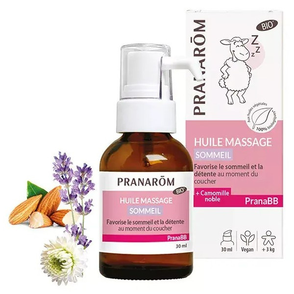 La formule de Pranarôm Huile de massage Sommeil Bio PranaBB inclut une synergie d’huiles essentielles aux vertus complémentaires qui favorisent le sommeil et la relaxation de bébé. L’extrait de camomille noble détient des propriétés calmantes, sédatives et anxiolytiques qui apaisent les angoisses et l’excitation du petit. Les vertus de l’essence de lavande vraie aident l’enfant à retrouver sa quiétude en cas d’agitation au moment d'aller dormir. Les huiles essentielles de ravintsara et d’orange douce sont connues pour leurs actions relaxantes. Les huiles végétales d’amande douce, de tournesol et de coco complètent la composition pour protéger et nourrir le derme sensible de bébé. Conditionnement : flacon-pompe de 30ml.