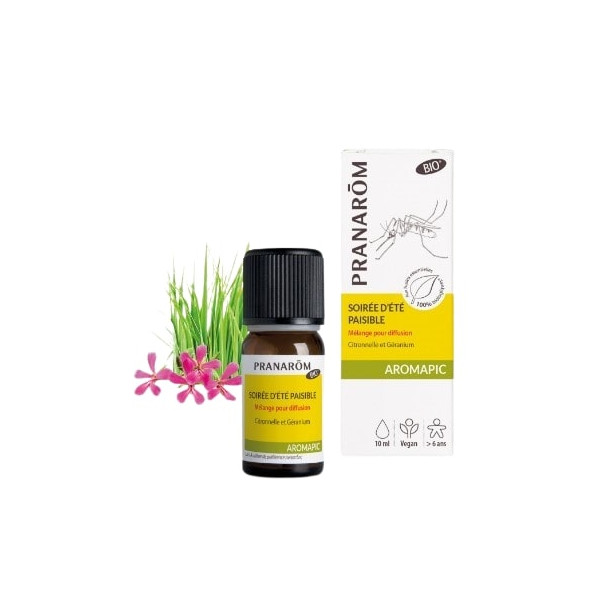 Aromapic Soirée d'été paisible Bio de Pranarôm est un mélange d'huiles essentielles biologiques pour diffusion, aux senteurs de citronnelle et de géranium, utilisé pour repousser les moustiques.