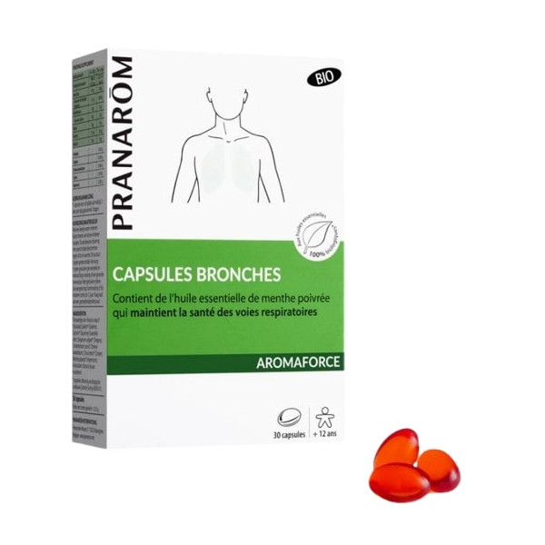 Pranarôm Aromaforce Capsules Bronches Bio est un complément alimentaire à base d'huiles essentielles pour décongestionner et dégager les bronches.