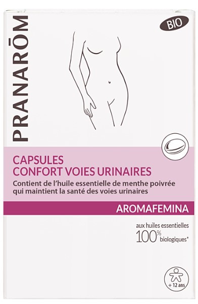 Aromafemina Caspules Confort Voies Urinaires Bio de Pranarôm est un complément alimentaire à base d'huile essentielle de menthe poivré pour soulager les inconforts urinaires et maintenir la santé des voies urinaires.