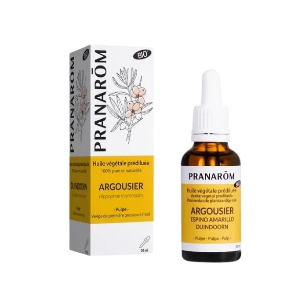 L'Huile Végétale Argousier Bio de Pranarôm,100 % pure et naturelle, est un véritable sérum vitaminé pour la peau qui procure un effet bonne mine immédiat. Cette huile végétale favorise la régénération cutanée et prévient le vieillissement.