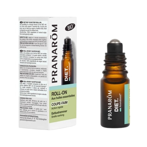 Aromaboost Diet Roll-On Bio est un roll-on olfactif des laboratoires Pranarôm. Il s’agit d’une marque proposant plus de 250 références d’huiles essentielles et d’huiles végétales destinées à la santé, à la beauté et au bien-être. L’Aromaboost Diet est une solution coupe-faim immédiate et durable conçue pour réduire les fringales.