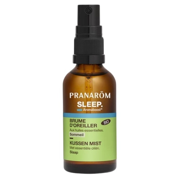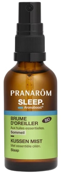 Aux huiles essentielles, Aromaboost Sleep Brume d'Oreiller Bio de Pranarôm favorise l'endormissement et un sommeil réparateur. Il s'utilise idéalement en complément de la cure et du Roll-on Sleep.