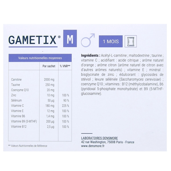 Gametix M agit en favorisant la fertilité masculine et en améliorant la qualité du sperme. Spécialement conçu pour les hommes en désir d’enfant, ce complément alimentaire mis au point par les laboratoires Densmore contient une combinaison d’actifs visant à optimiser les fonctions reproductives.
