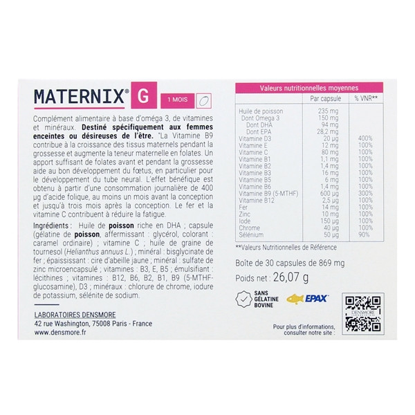 Maternix G Grossesse, boîte de 30 capsules, est fabriqué en France par le laboratoire Densmore, un spécialiste de la santé féminine et engagé auprès des gynécologues.