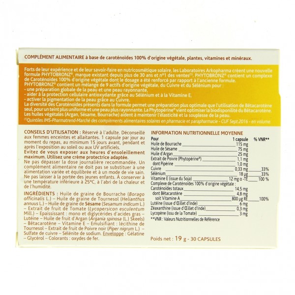 Les Laboratoires Arkopharma créent une nouvelle formule PHYTOBRONZ®, composée d’un complexe de Caroténoïdes 100% d’origine végétale dont le dosage a été renforcé par rapport à l’ancienne formule, pour vous procurer une peau plus rayonnante et un teint plus unifié.