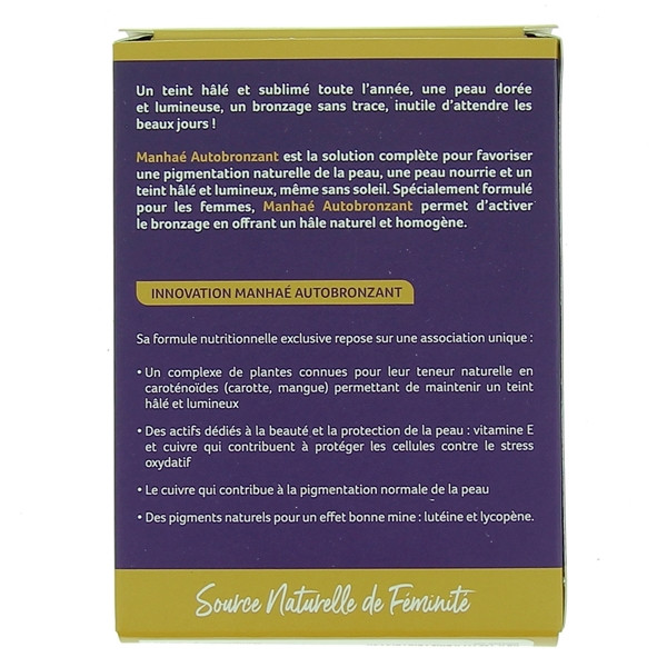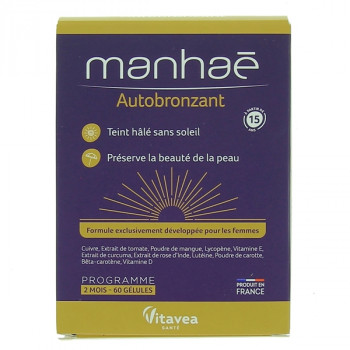 Manhaé Autobronzant est un complément alimentaire solaire utilisé pour favoriser la pigmentation naturelle de la peau. Il permet d'activer le bronzage en offrant un hâle naturel, lumineux et homogène toute l'année.