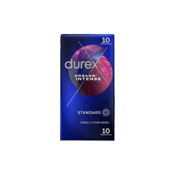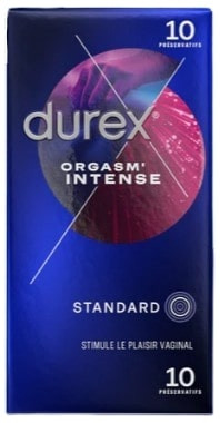 Orgasm' Intense de Durex est un préservatif épais, perlé et nervuré contenant un gel stimulant pour stimuler le plaisir vaginal.