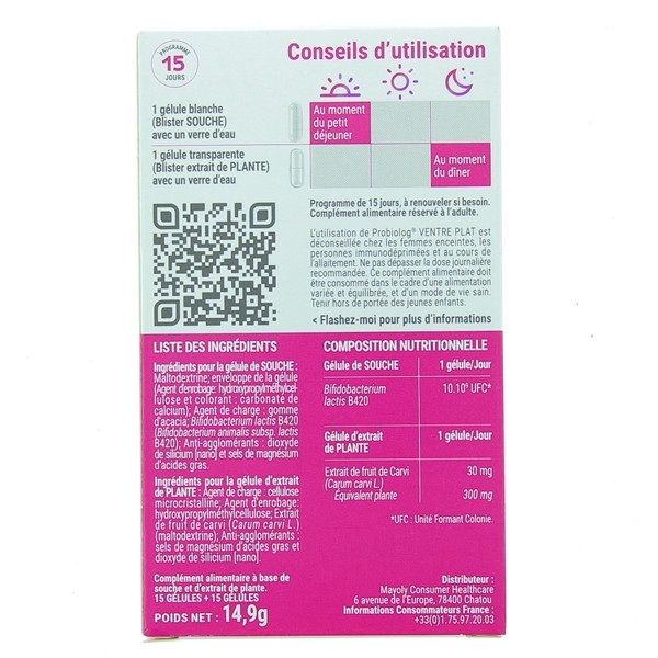 Le complément alimentaire Probiolog Ventre Plat se constitue de gélules blanches contenant une souche microbiotique et de gélules transparentes contenant des extraits de plantes. Il favorise la réduction des ballonnements pour avoir un ventre plus plat.