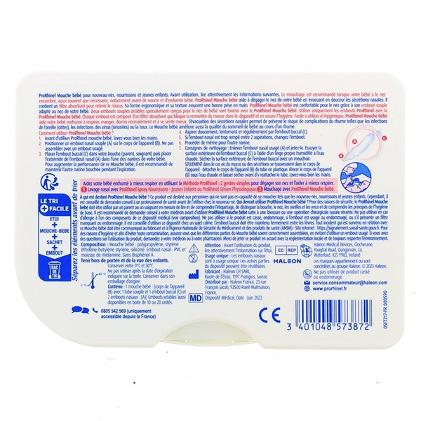 Ce Mouche-bébé est fabriqué en France par Prorhinel, une marque distribuée dans plus de 60 pays à travers le monde. Elle est réputée pour l’efficacité de ses dispositifs destinés au traitement des affections nasales des petits et des grands.