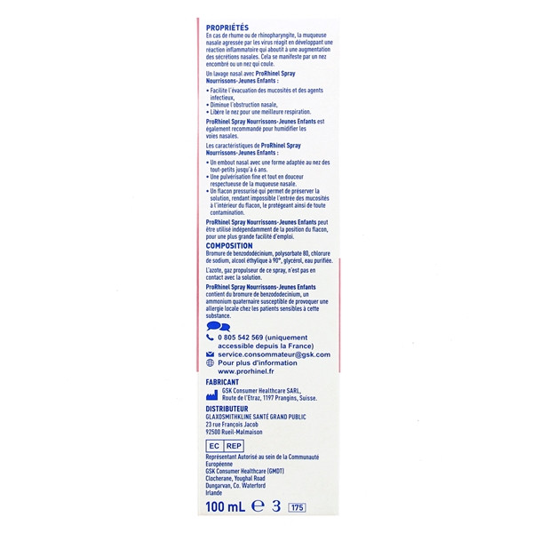 Spray Nasal Prorhinel Nourrisson Jeunes Enfants est doté d’un embout de forme adaptée à la narine des tout petits. Il permet d’extirper en douceur les mucosités et les agents infectieux, de désobstruer le nez et d’améliorer la respiration du jeune patient pour qu’il puisse profiter d’un bon sommeil. Sa formule intègre un fluidifiant (polysorbate 80) et un antiseptique (bromure de benzododécinium) qui associent leurs propriétés pour nettoyer et hydrater les fosses nasales, éliminer les sécrétions et soulager la congestion nasale. Le flacon aérosol de 100ml est conçu pour pulvériser finement la solution afin de ne pas irriter la muqueuse nasale.