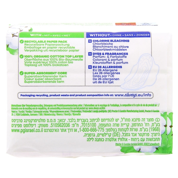 Les serviettes Always Cotton Protection Night ont été développés avec une feuille supérieure en 100 % coton biologique issu de filières responsables. Sans colorant, sans parfum et sans blanchissement au chlore, ces serviettes hygiéniques respectent la peau sensible des parties intimes.