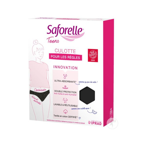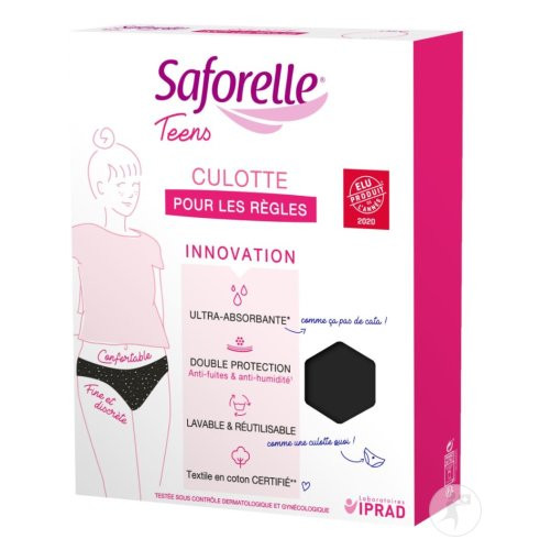 La culotte Saforelle Teens peut être portée au quotidien en prévision des premières règles, puis à chaque moment du cycle : juste avant les règles, ou pendant celles-ci, pour faire du sport ou encore la nuit. Disponible en taille 12 ans et 14 ans.