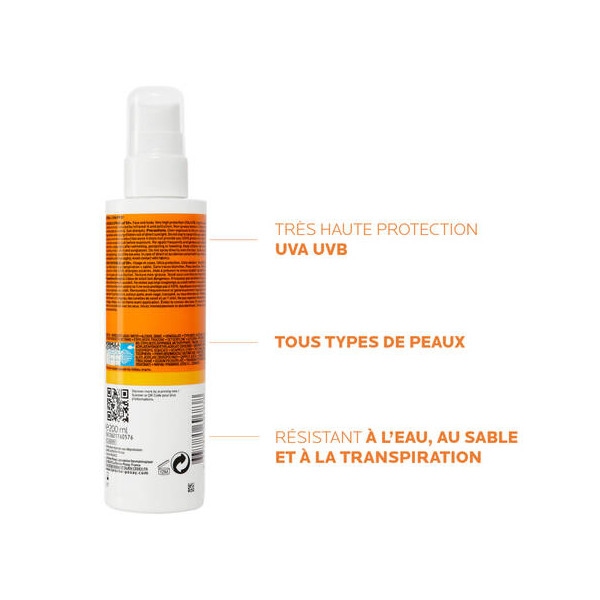 Anthelios Spray Invisible SPF50+ offre une très haute protection UVA/UVB large et photostable grâce aux filtres et une très haute résistance à l'eau, à la transpiration et au sable.