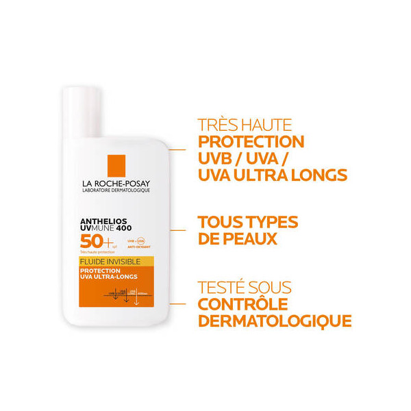 La crème solaire Anthelios UVmune 400 Fluide Invisible SPF 50+ des laboratoires La Roche Posay est conçue pour protéger la peau du visage des effets nuisibles des ultra-violets. Formule avec parfum, testée dermatologiquement, elle convient à tous les types de peaux, même les plus sensibles.