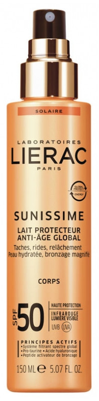 Sunissime lait protecteur anti-âge global est un lait de protection solaire SPF50 pour le corps. Il assure une haute protection contre les rayons du soleil afin de protéger la peau des signes de photovieillissement (taches, rides, relâchements). Grâce au lait solaire Lierac, la peau est hydratée et le bronzage est sublimé.