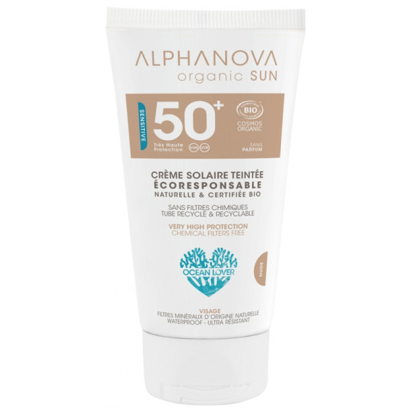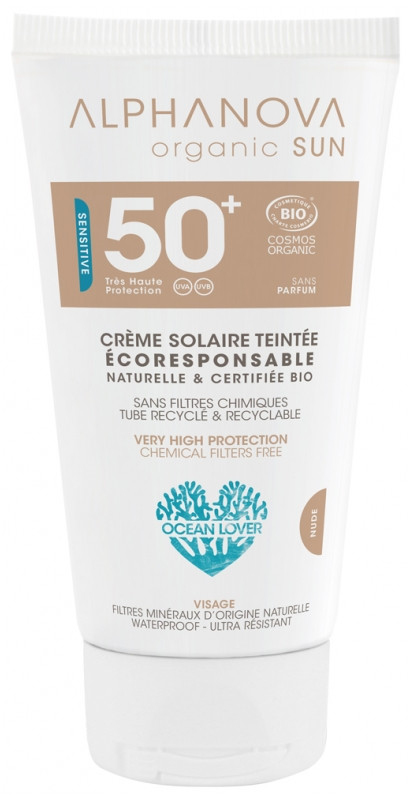 La Crème Solaire Sun Sensitive Teintée Nude Sans Parfum SPF50+ Bio 50 g Alphanova est naturelle, invisible et certifiée BIO COSMOS par ECOCERT. Elle contient des filtres 100 % minéraux, qui protègent efficacement contre les UVA et les UVB. Elle est sans parfum, non grasse et enrichie en Aloé Vera, huile de Jojoba et de Tamanu pour hydrater et protéger la peau. Cette crème solaire convient aux teints clairs et ne laisse pas de traces blanches. Elle est waterproof, sans filtres chimiques ni parabens.