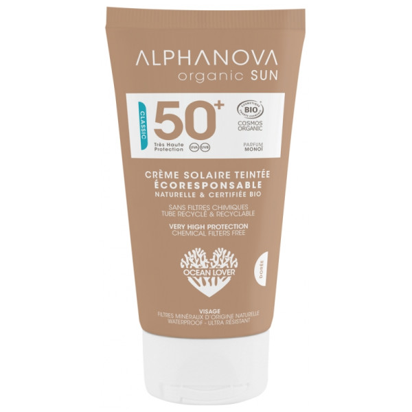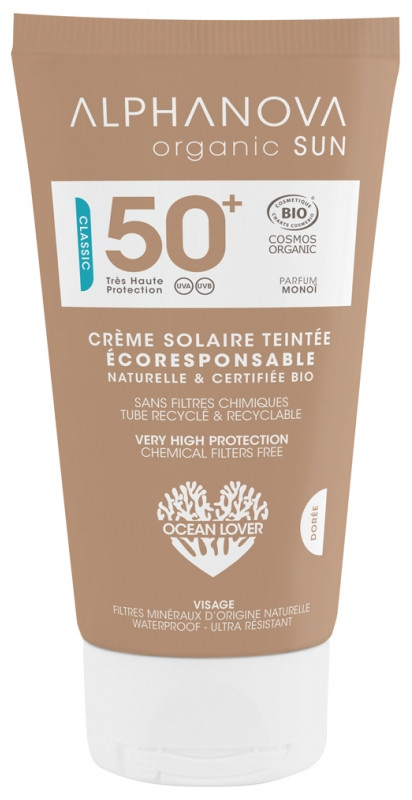 La crème solaire teintée visage SPF50+ 50 g Alphanova est une protection solaire aux origines naturelles. En effet, elle dispose d’une certification BIO COSMOS délivré par ECOCERT.
