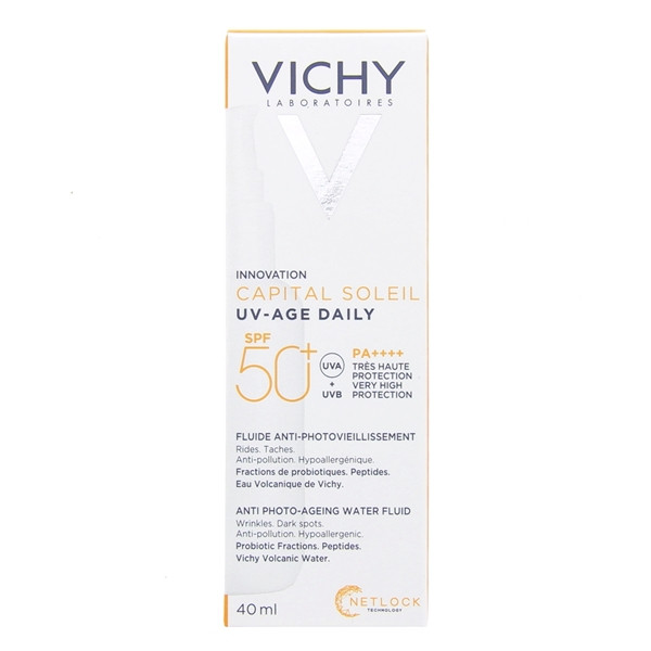 Le Capital Soleil UV-Age Daily SPF50+ Vichy est une crème solaire efficace destinée seulement pour le visage. La technologie multi-brevetée Netlock lui permet d’offrir un haut niveau de protection contre les rayonnements solaires UVA et UVB. La fiabilité de ce produit a été prouvée cliniquement.