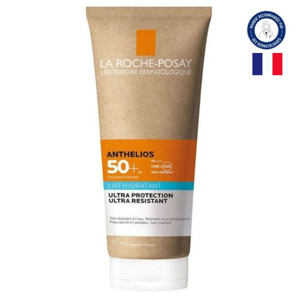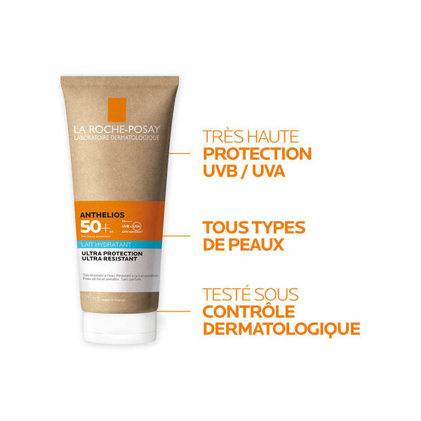 Anthelios Lait hydratant SPF50+ est une protection solaire sans parfum, sans paraben, allégé en filtres chimiques, non comédogène et très résistant à l'eau. Il offre une très haute protection contre les rayons du soleil.