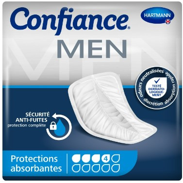 La protection Confiance Men 4G, spécial homme, du laboratoire Hartmann, est muni d’un triple coussin absorbant Dry Plus pour un effet garde au sec instantané. Les barrières antifuites hydrophobes latérales confèrent une sécurité optimale.
