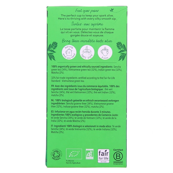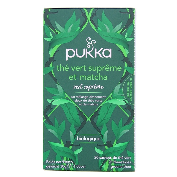 Conditionnée en boite de 20 sachets, l’infusion Thé Vert Matcha Suprême est constituée à 100 % d’ingrédients issus de l’agriculture biologique. C’est d’ailleurs un principe que Pukka applique à tous ses produits. En ce qui concerne l’emballage, il est complètement recyclable, ce qui permet de réduire les déchets rejetés dans la nature. La marque tient une ligne de conduite équilibrée : répondre à des exigences sociétales et environnementales strictes tout en veillant au bien-être de ses consommateurs.