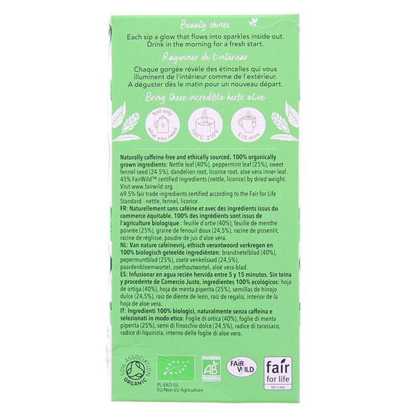 Cette infusion conditionnée en boite de 20 a été pensée pour vous aider à nettoyer votre organisme grâce aux bienfaits de diverses plantes. Sa formule comprend des feuilles d’ortie, des feuilles de menthe poivrée, des graines de fenouil, des racines de réglisse, des racines de pissenlit et de l’extrait d’aloe vera. Chaque composant a été trié sur le volet pour vous procurer une infusion de qualité. D’autant plus que ces plantes sont issues de l’agriculture biologique.