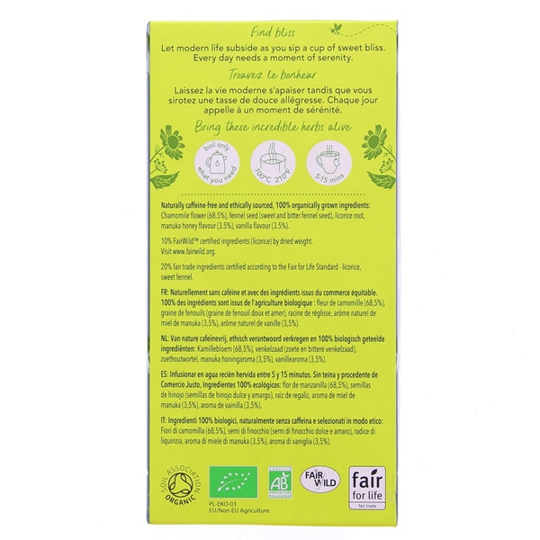 L’infusion Camomille, Vanille & Miel de Manuka Bio est conditionnée en boîte de 20 infusettes sans plastique.