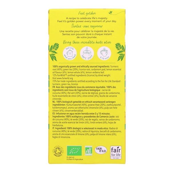 Conditionnée en boite de 20 dosettes, cette infusion est un parfait allié pour illuminer votre journée. Accompagnée de petits biscuits ou d’encas plus sains, elle sera idéale pour une petite pause réconfortante. En plus du curcuma, cette préparation pour boisson chaude vous fait profiter des saveurs et des vertus de plantes telles que le thé vert Suoi Gang et la cardamome. Le tout est relevé par une subtile note de citron. Ces plantes ont été minutieusement sélectionnées pour vous offrir une infusion riche, délicieuse et parfumée.