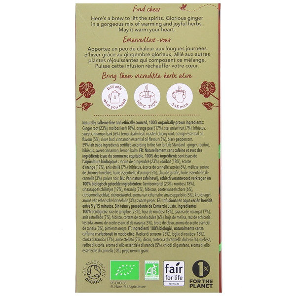 Racine de Gingembre (23 %), Rooibos (18 %), Écorce d’Orange (17 %), Anis Étoilé (7 %), Hibiscus, Écorce de Cannelle Sucrée (6 %), Mélisse, Racine de Chicorée Torréfiée, Huile Essentielle d’Orange (5 %), Clou de Girofle, Huile Essentielle de Cannelle (3 %), Poivre Noir.