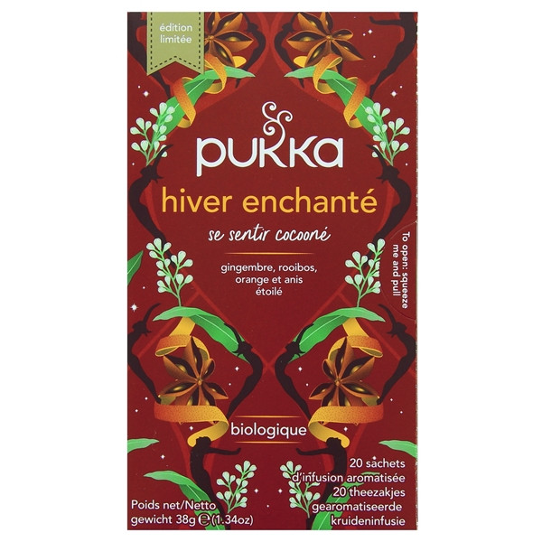 L'infusion Hiver Enchanté Bio de la marque Pukka est un mélange de gingembre, rooibos, orange et anis étoilé pour se sentir cocooné.